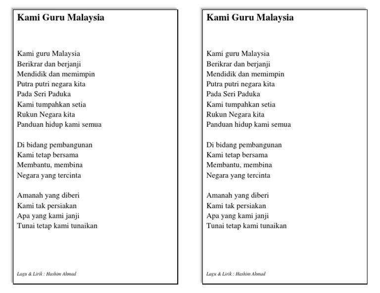Berikut dikongsikan lirik lagu ' kami guru malaysia ' bersama lirik dan video rasmi oleh kpm untuk rujukan semua. Kami guru malaysia berikrar dan berjanji mendidik dan memimpin putra putri negara kita. Mendidik dan memimpin putra putri negara kita. Lagu guru malaysia kami guru malaysia berikrar dan berjanji. Pada seri paduka kami tumpahkan . Kami guru malaysia berikrar dan berjanji.